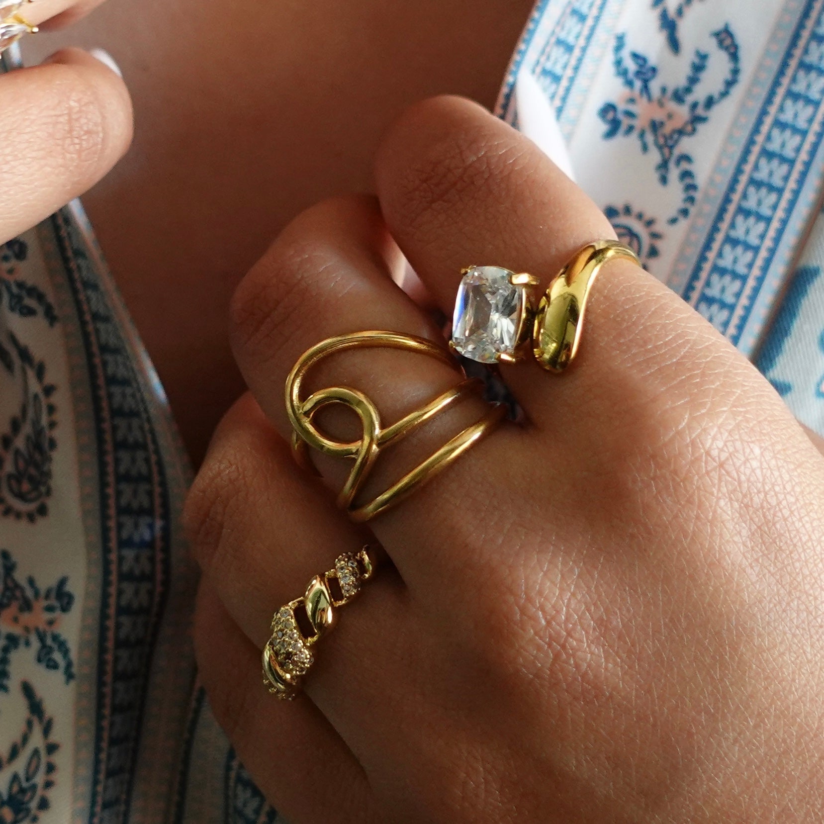 Der Ümi Ring – fließende Dynamik beeindruckt mit seiner kunstvoll verschlungenen Form, die Leichtigkeit und Eleganz ausstrahlt. Die geschwungenen Linien verleihen dem Design eine fließende Dynamik und machen ihn zu einem besonderen Blickfang. Mit seinem goldenen Glanz und der offenen, verstellbaren Form ist der Ümi Ring ein stilvolles Schmuckstück, das Individualität und Raffinesse perfekt vereint.